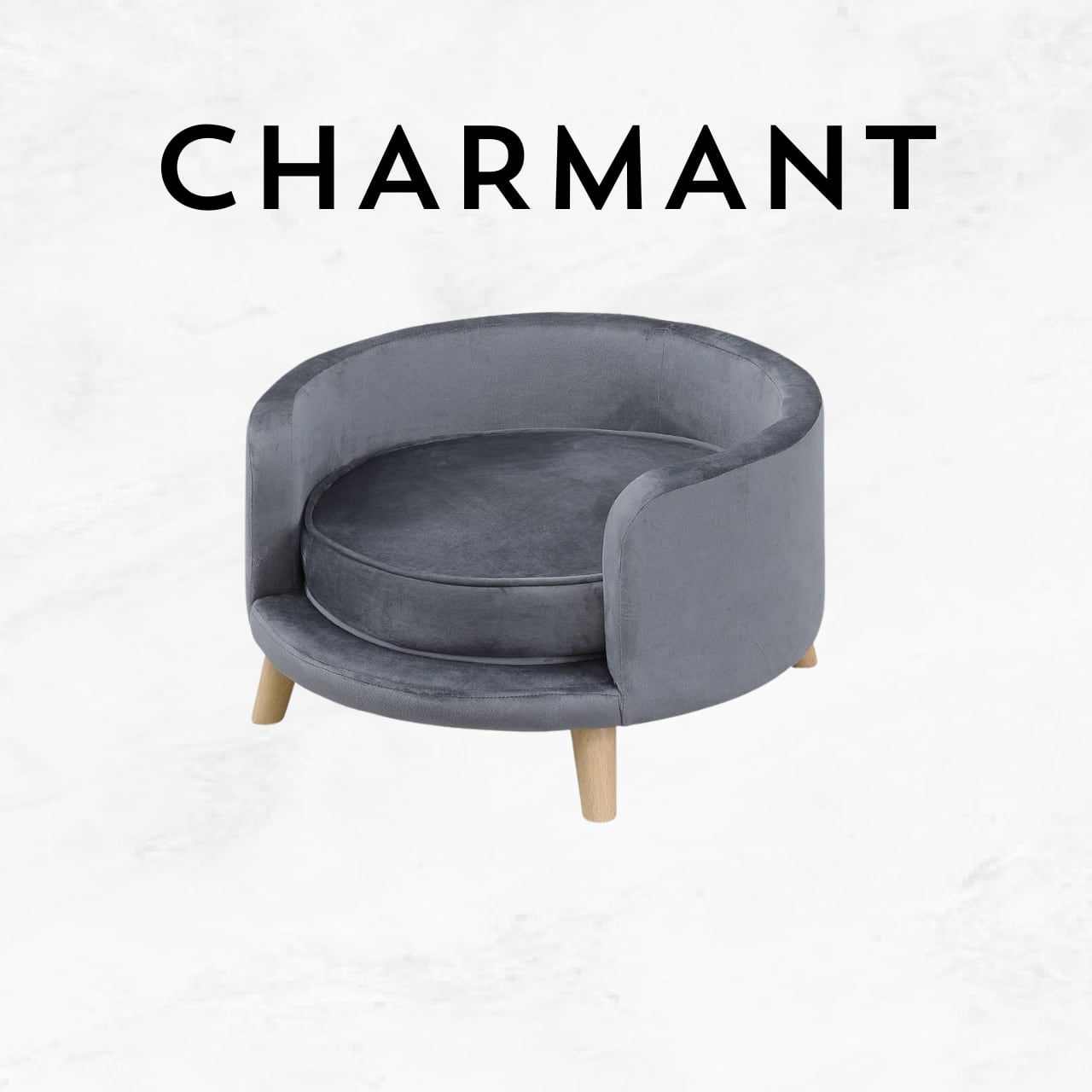 Charmantは、愛らしい丸い形状が目を引くグレーのペットソファです。上質なベロア生地を使用しており、ペットにとって居心地の良いスペースを提供します。シンプルかつ洗練されたデザインは、どんなインテリアにも調和し、特別な癒しの空間を演出します。しっかりとした作りのこのソファは、安心して愛するペットにご利用いただけます。