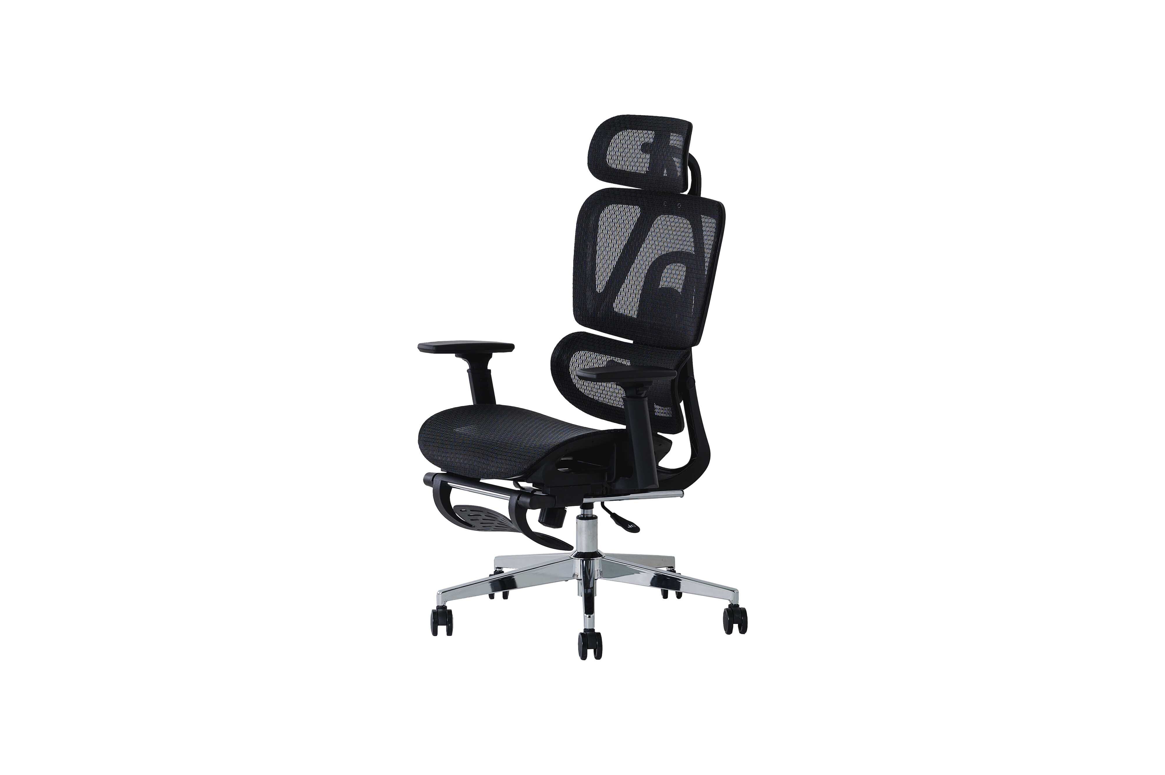 【素材】 ・硬質メッシュ・ガス圧昇降式・ヘッドレスト:(昇降、可動)・肘部:(6段階昇降、前後可動)・背面:上下可動式・ウエストサポート:ダイヤル調節 ・座面前後可動式・フッドレスト付・リクライニング機能