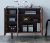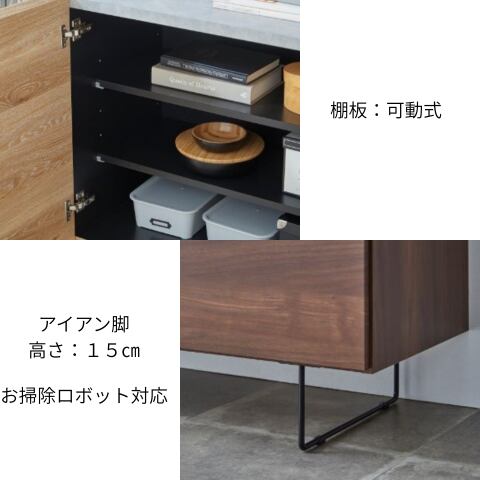機能的でありながら美しいデザインのダブル 90サイドボードは、リビングやダイニングをスタイリッシュに演出します。可動棚を採用しているため、収納スペースを自由に調整でき、様々なアイテムを整理整頓するのに役立ちます。さらに、お掃除ロボット対応設計で、日々のお手入れも簡単です。