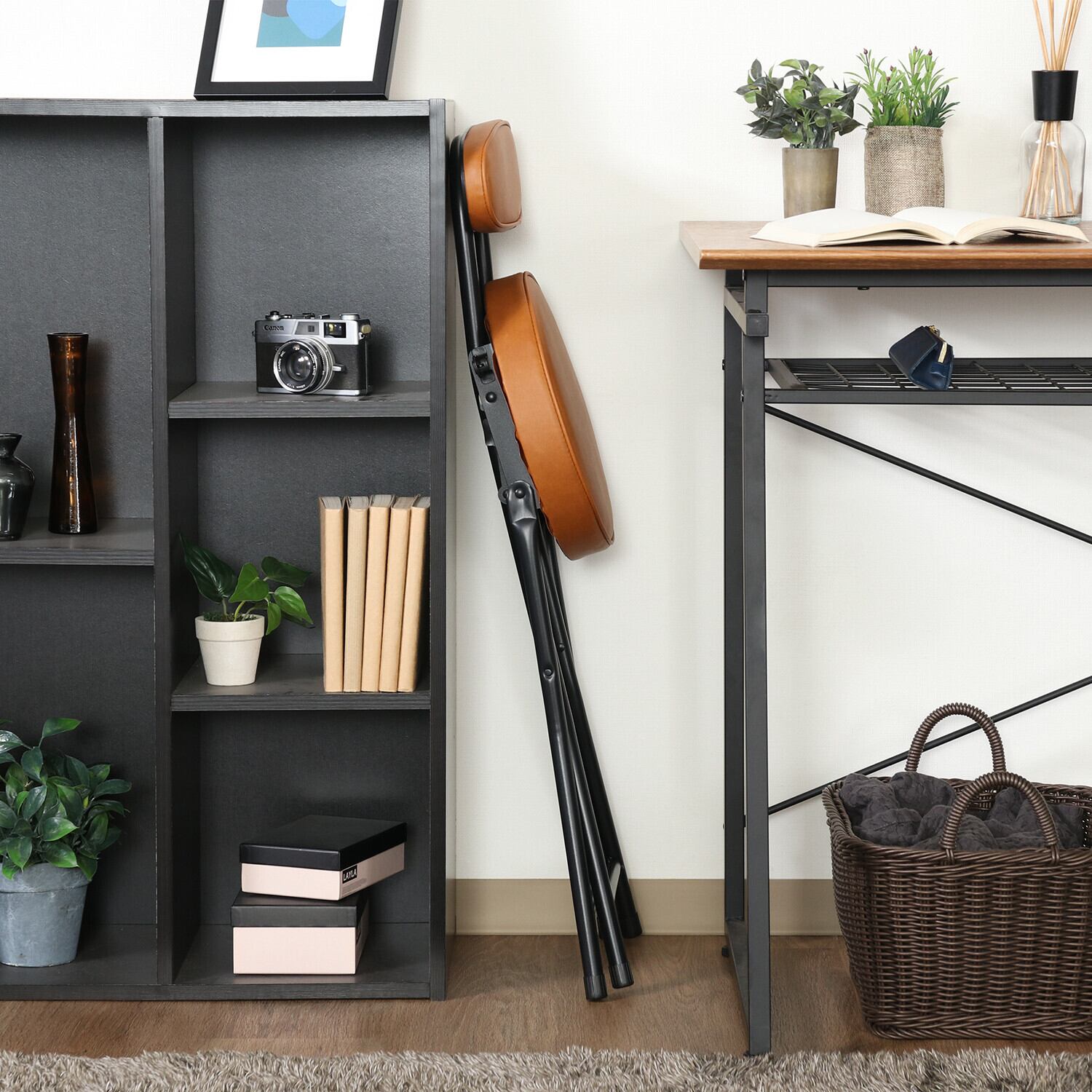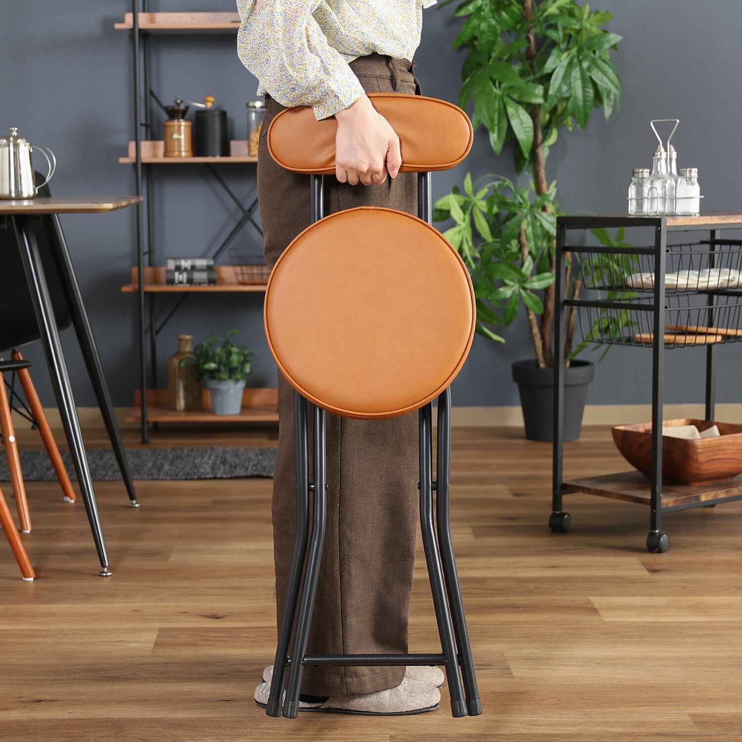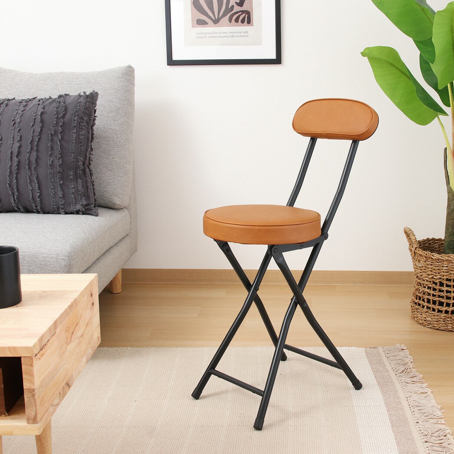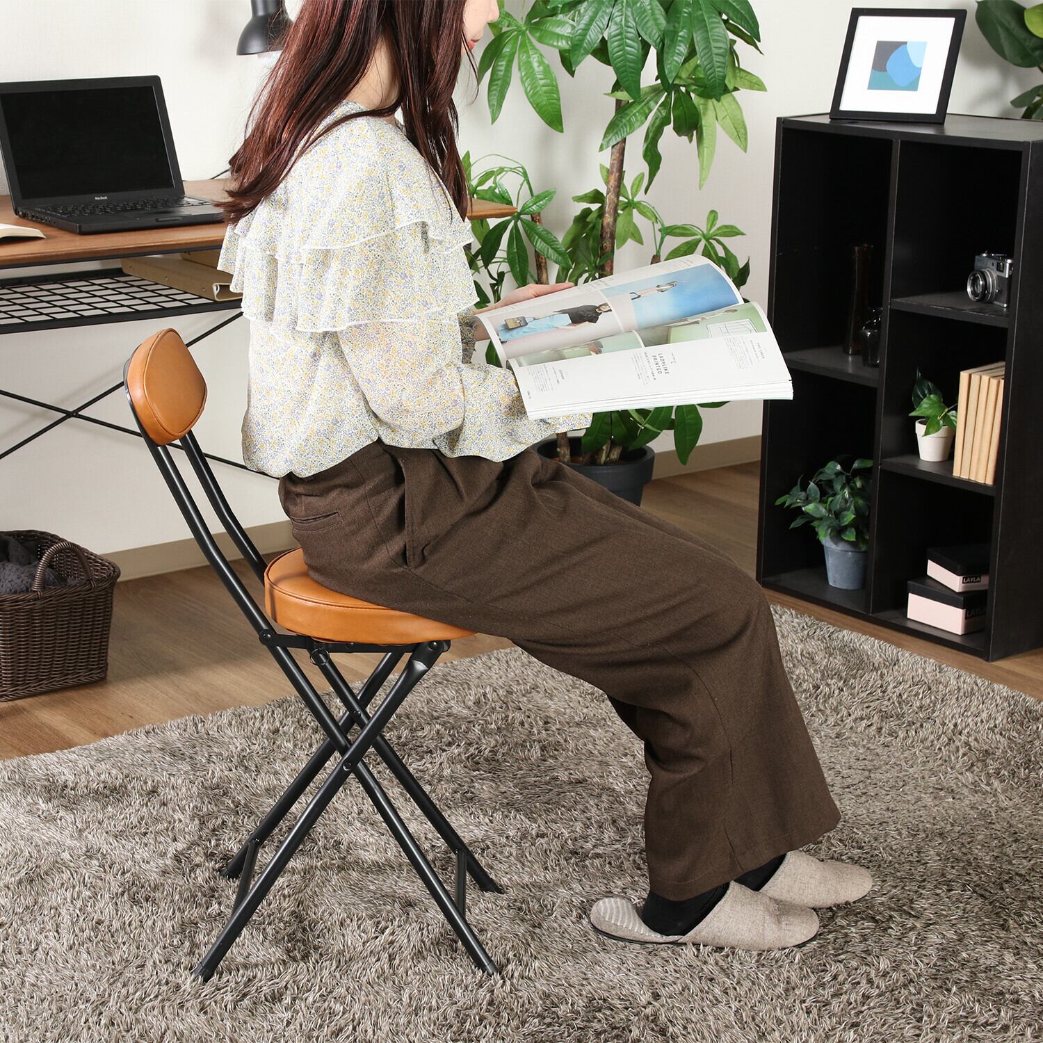 この折りたたみチェアPUは、使わない時はコンパクトに折りたたむことができるため、収納にも困りません。背もたれがついていることで、安定した座り心地を提供し、来客時にも大活躍します。