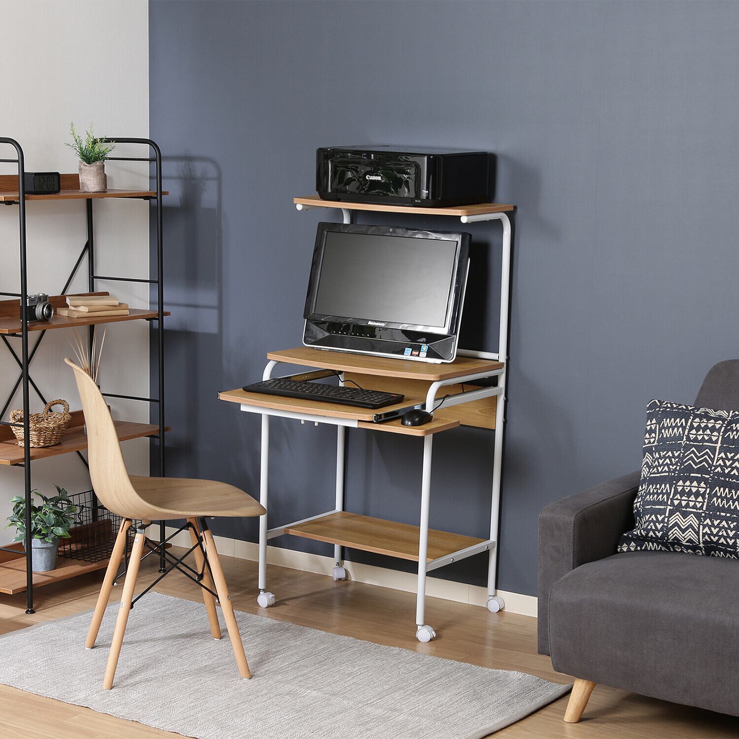 高さを活かした収納付きのコンパクトデスクです。このデスクは、必要なスペースにおさまり、作業効率をアップさせる特徴を持っています。