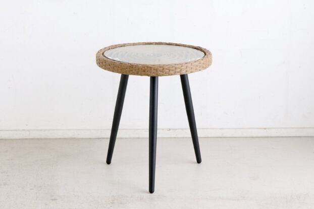 天板:ポリエチレン(ラタン調)/ ガラス:強化5mm透明ガラス / 脚部:スチール(粉体塗装)