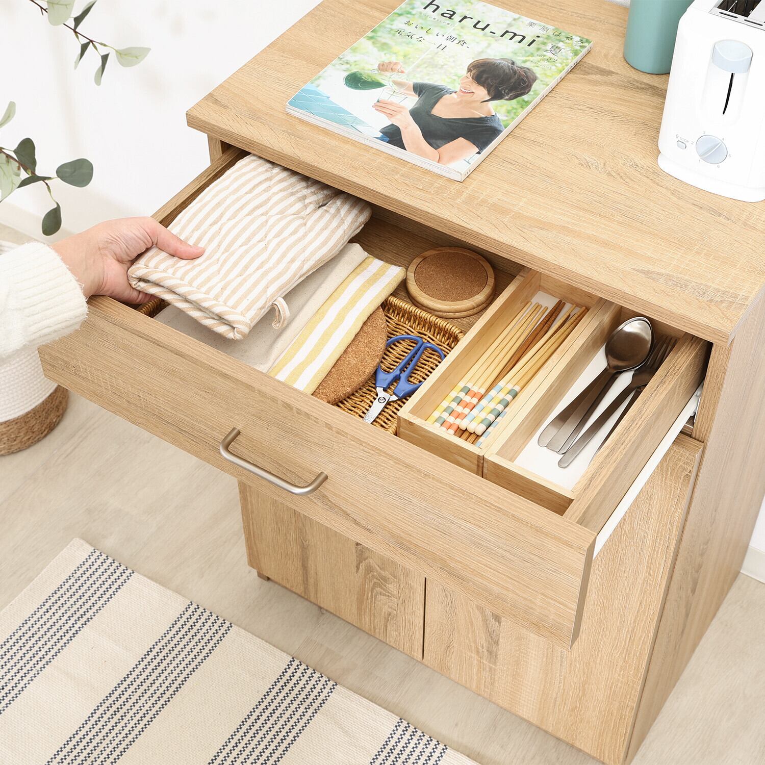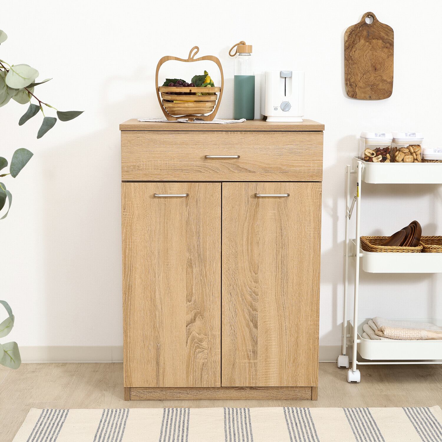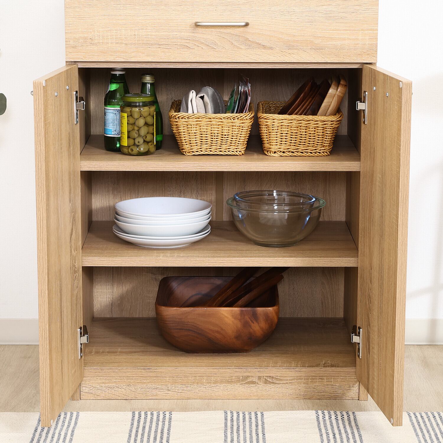 ◆演出:シンプルでありながらスタイリッシュなデザインが魅力のこのキャビネットは、豊富な収納スペースを提供し、使いやすいキッチン空間を実現します。日常の調理器具や食材をすっきり収納でき、快適な料理時間をサポートします。