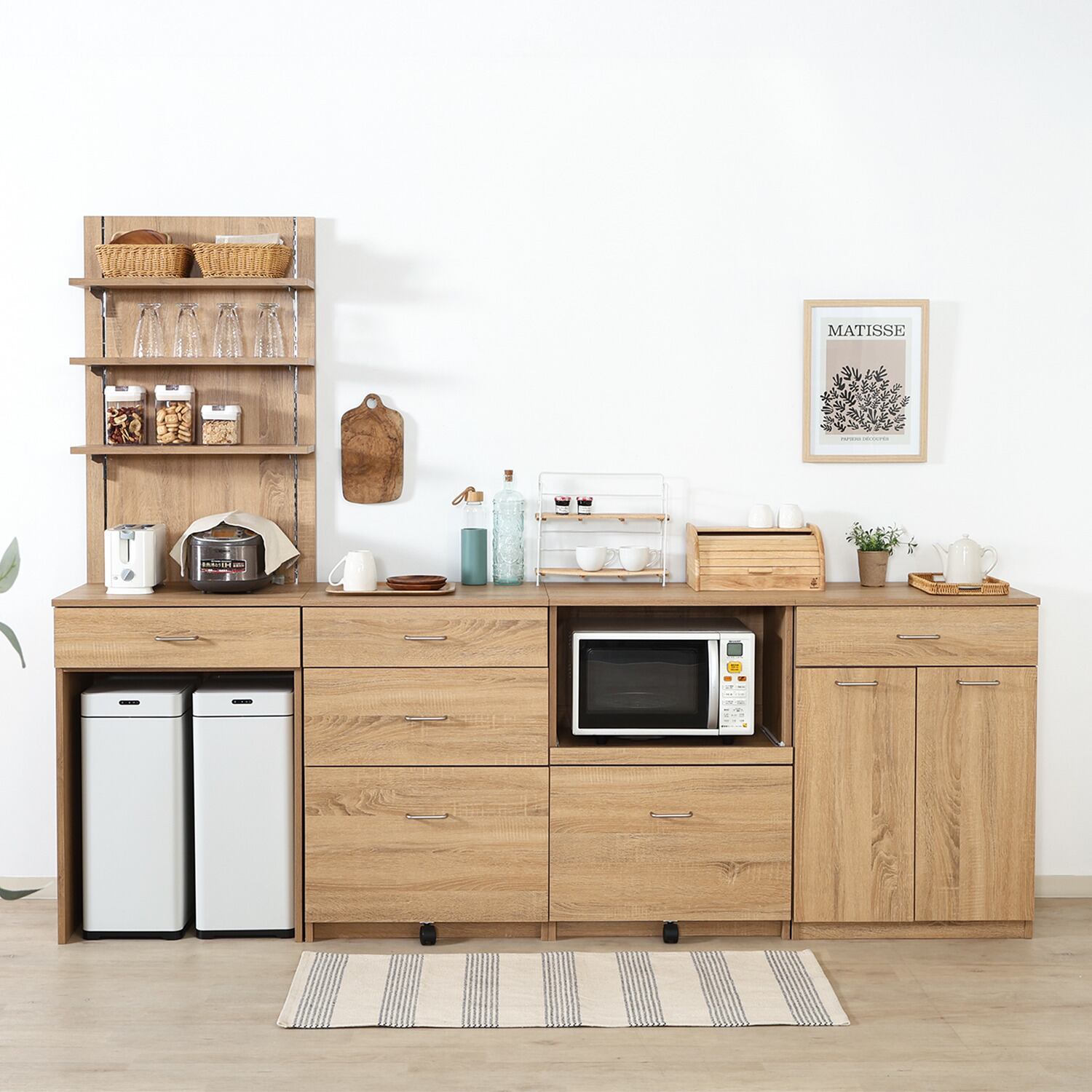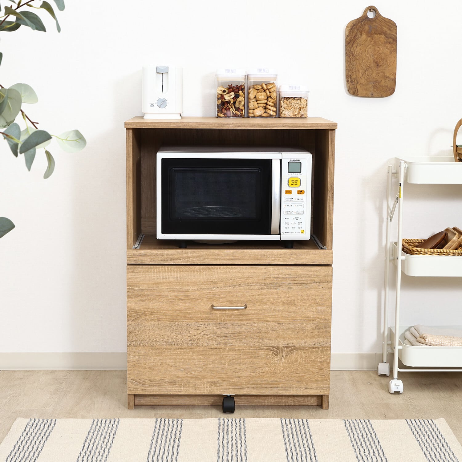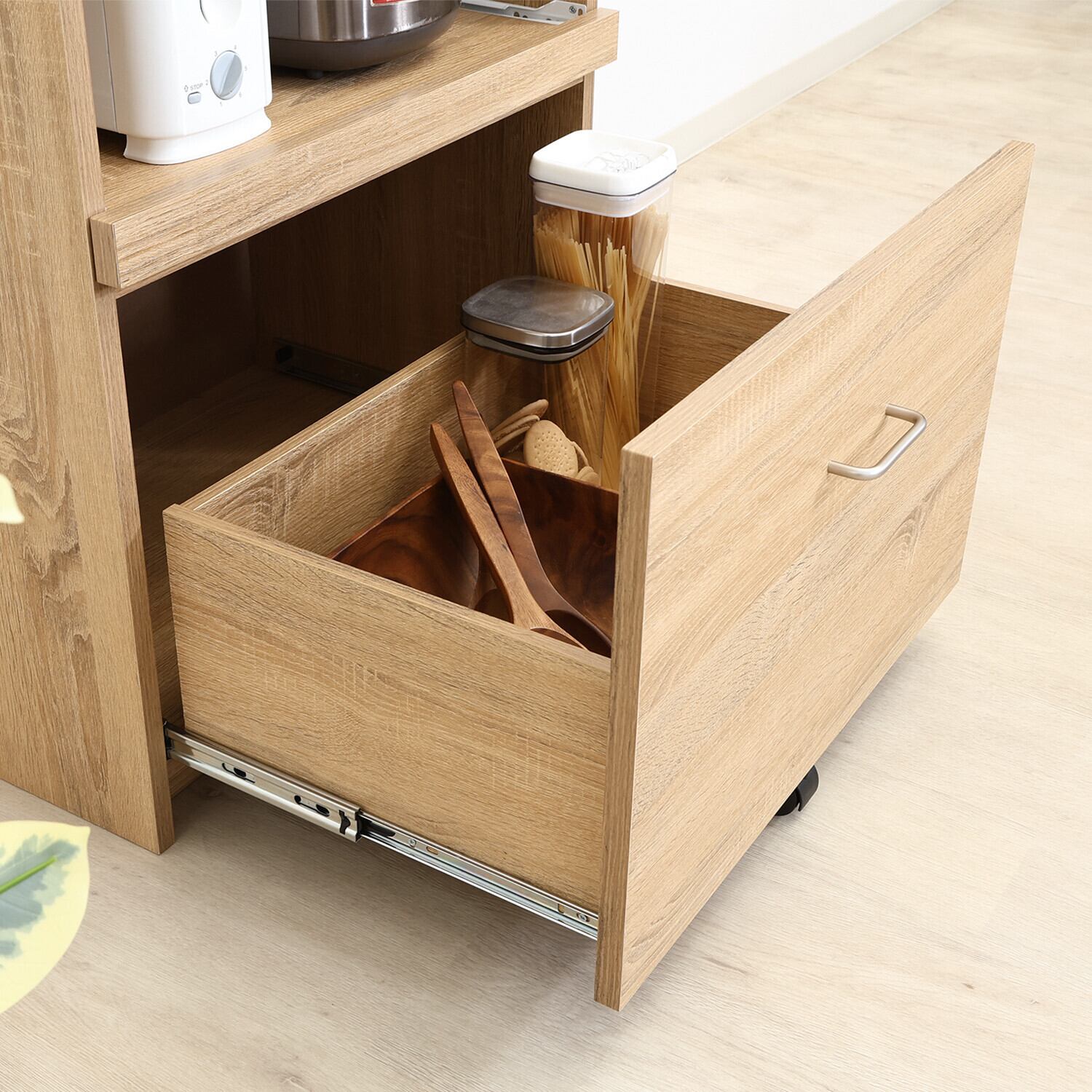 ◆演出:シンプルでありながらスタイリッシュなデザインが魅力のこのレンジボードは、豊富な収納スペースを提供し、使いやすいキッチン空間を実現します。電子レンジや調理器具、食材をすっきり収納でき、快適な料理時間をサポートします。