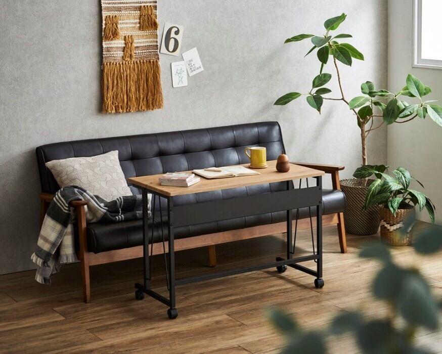 ◆演出:おしゃれな木目調の天板が、温もりを感じさせるスタイリッシュなテーブルを演出。キャスター付きで移動も簡単なので、様々なシーンで活躍します。リビングではコーヒータイムや読書、お仕事のデスク代わりにも使える便利なアイテムです。