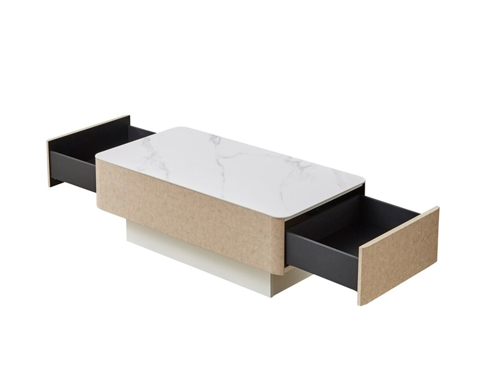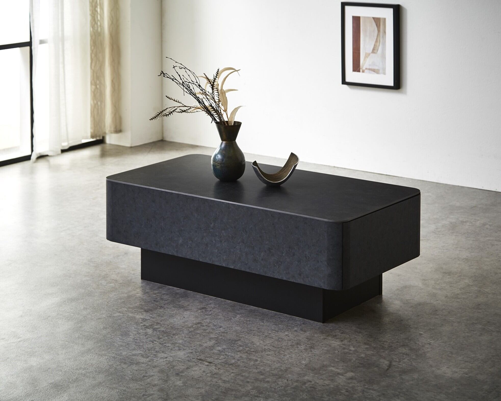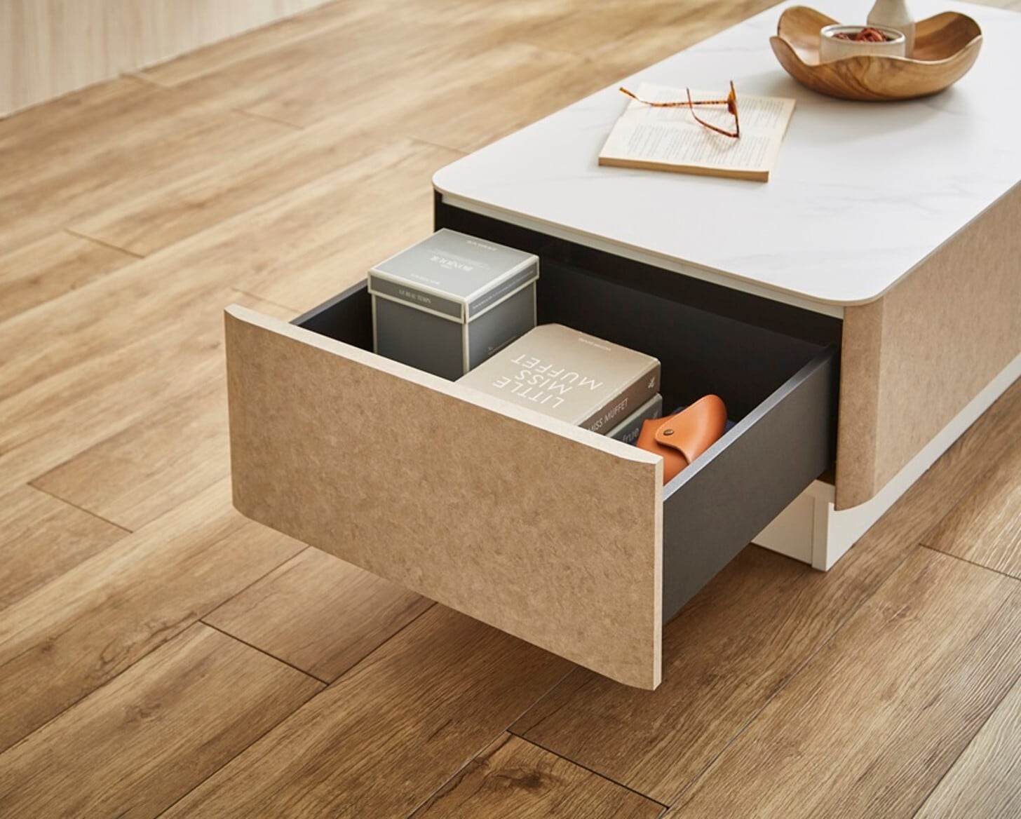 ティアロ リビングテーブルは、引出しが押すだけで静かに閉まるフルオープン設計で、使いやすさが魅力です。リビングやダイニングの中心に置くだけで、あなたのお部屋が一層引き立ちます。