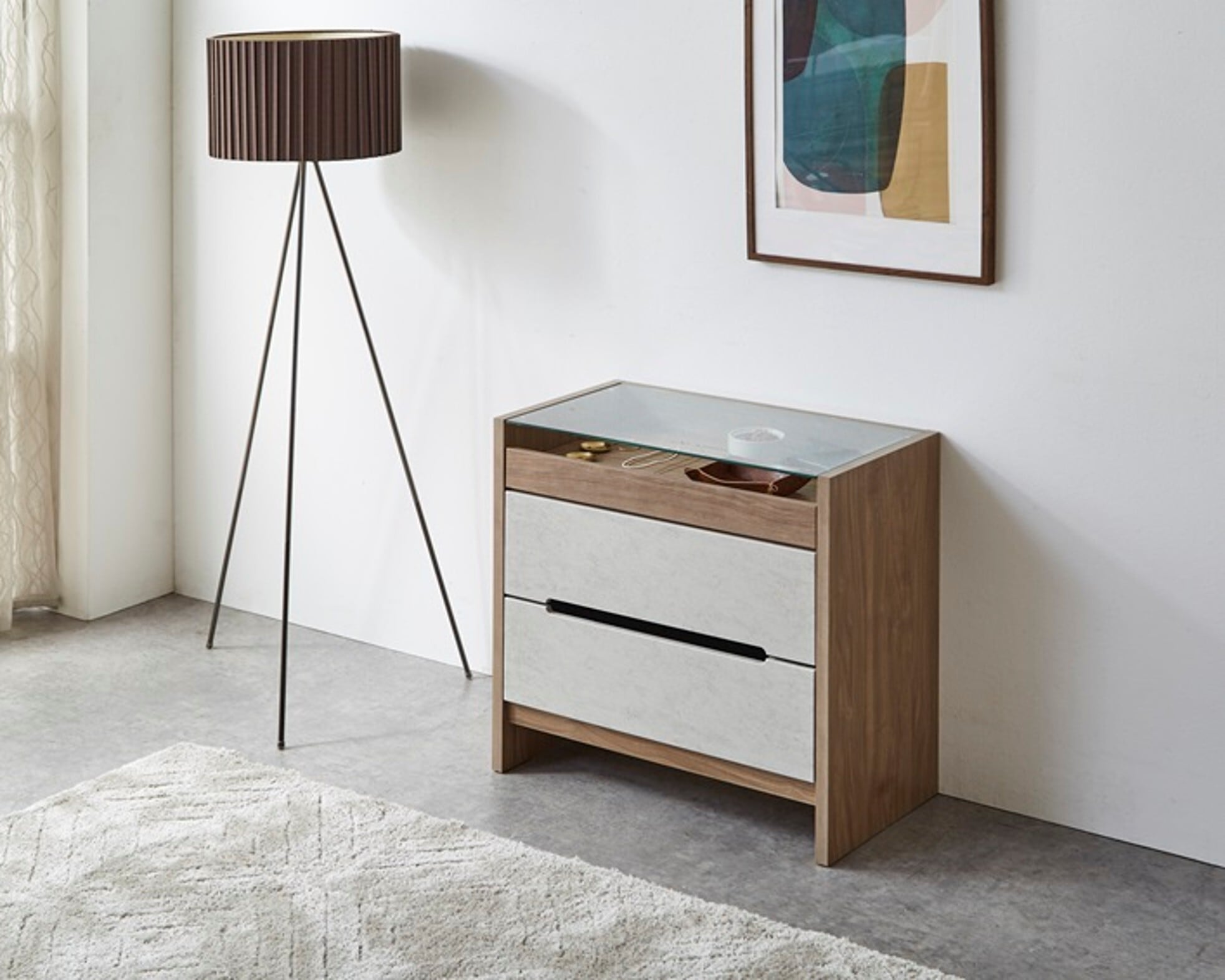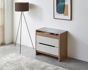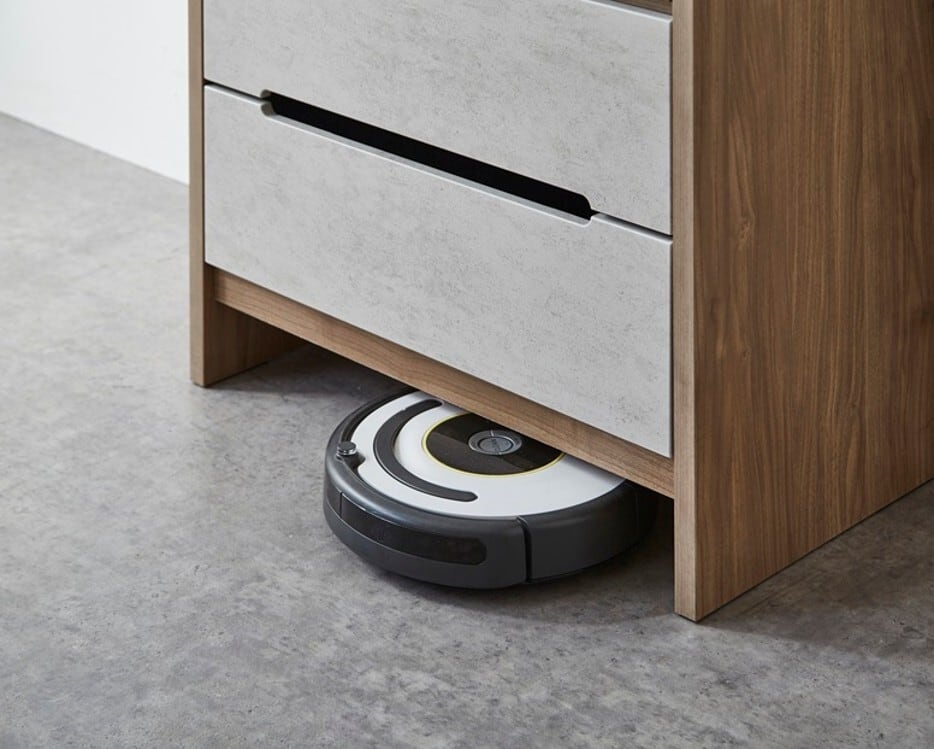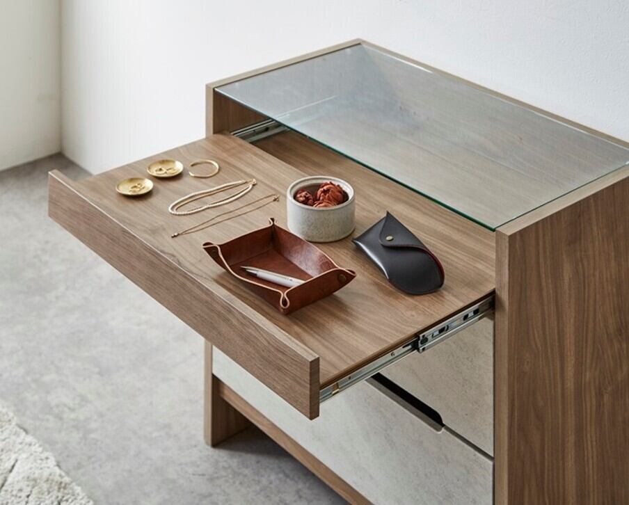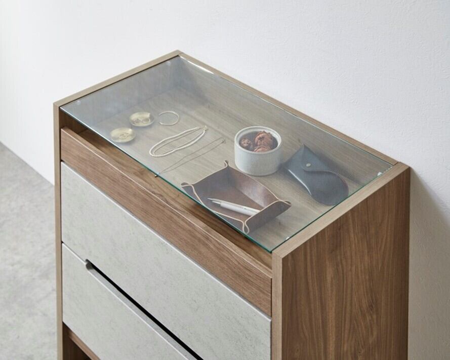 お掃除ロボット対応の便利な機能を備えたモアール コレクションチェストが新たにラインアップしました!スライド棚仕様のガラス天板部分は、好きな小物や趣味のグッズを飾り、日々の生活をより楽しく彩ることができるアイテムです。