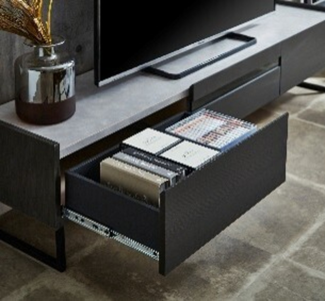上品かつ重厚感のあるデザインが魅力のステラ 150テレビボードが新たにラインアップしました!ブラック×グレーの無彩色で統一され、インテリアに洗練された雰囲気をプラスします。また、脚を取り付けずに台輪タイプのテレビボードとしてもご使用いただけるのが嬉しいポイントです。