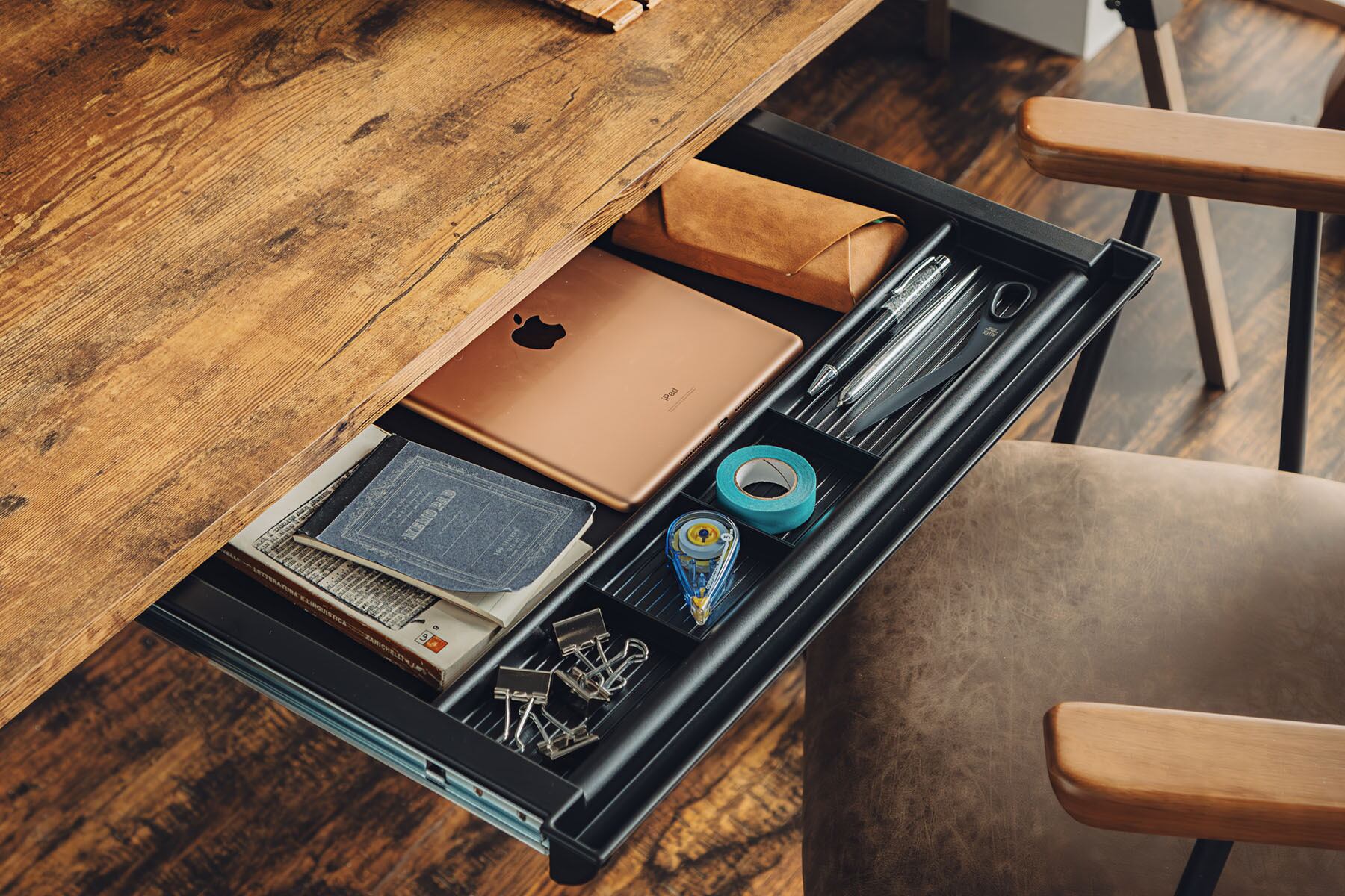 DBR・・・天板・棚板:強化紙、パーティクルボード(PB) / 脚部:スチール(粉体塗装)/ 引出トレー:ABS製