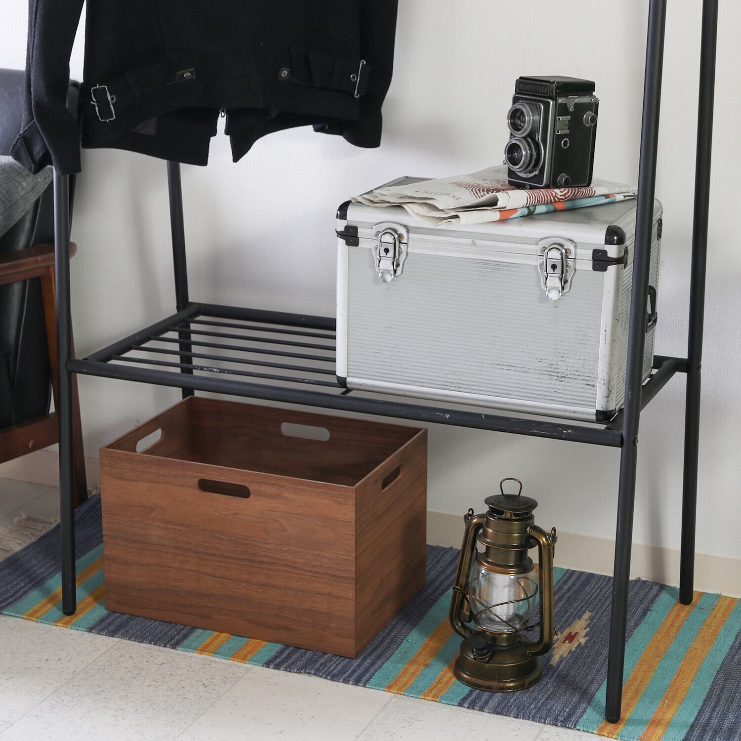 素材 ■構造部材(フレーム):金属(鋼) ■表面加工(フレーム):エポキシ樹脂塗装 ■表面材(棚板):オーク突板 ■表面加工(棚板):ラッカー塗装