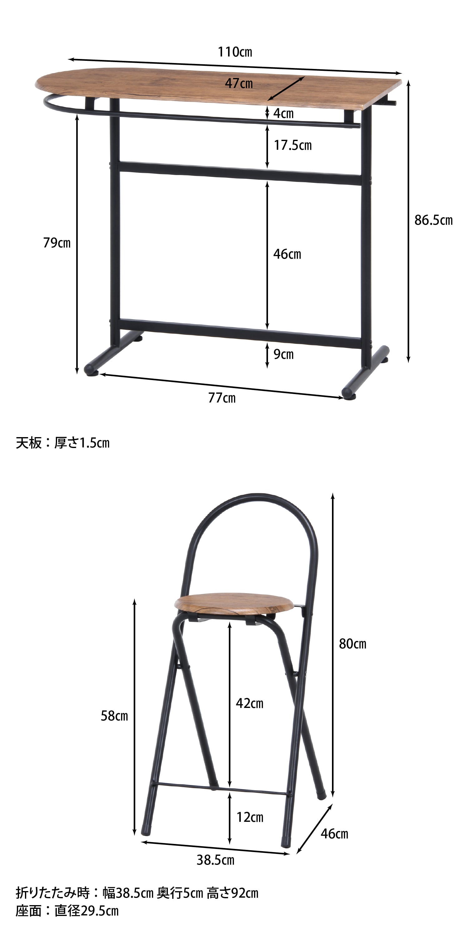 素材 ■甲板の表面材(テーブル天板):合成樹脂化粧繊維板 ■構造部材(テーブルフレーム):金属(鋼)[エポキシ樹脂塗装] ■構造部材(チェア座面):合成樹脂化粧繊維板 ■構造部材(チェアフレーム):金属(鋼)[エポキシ樹脂塗装]
