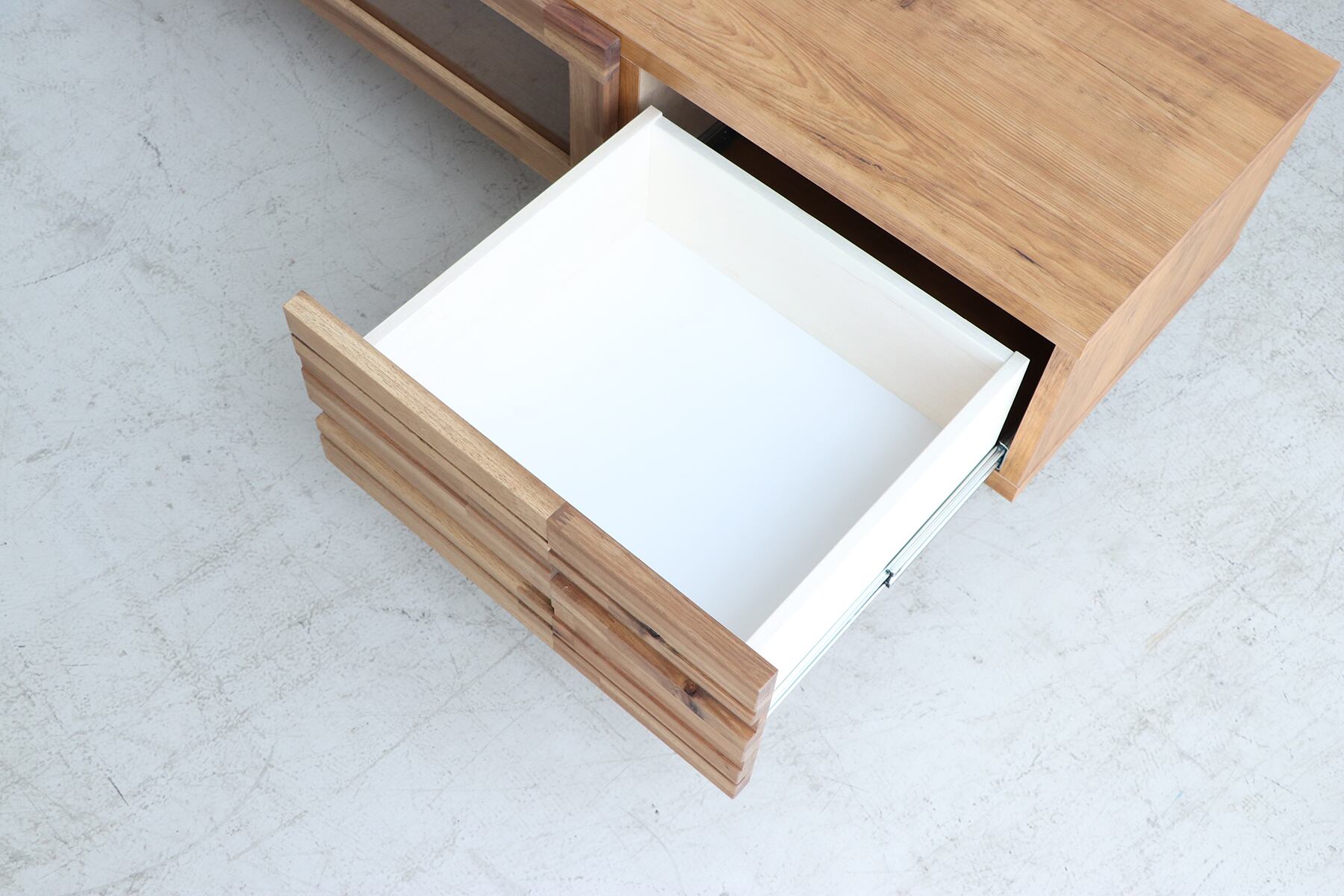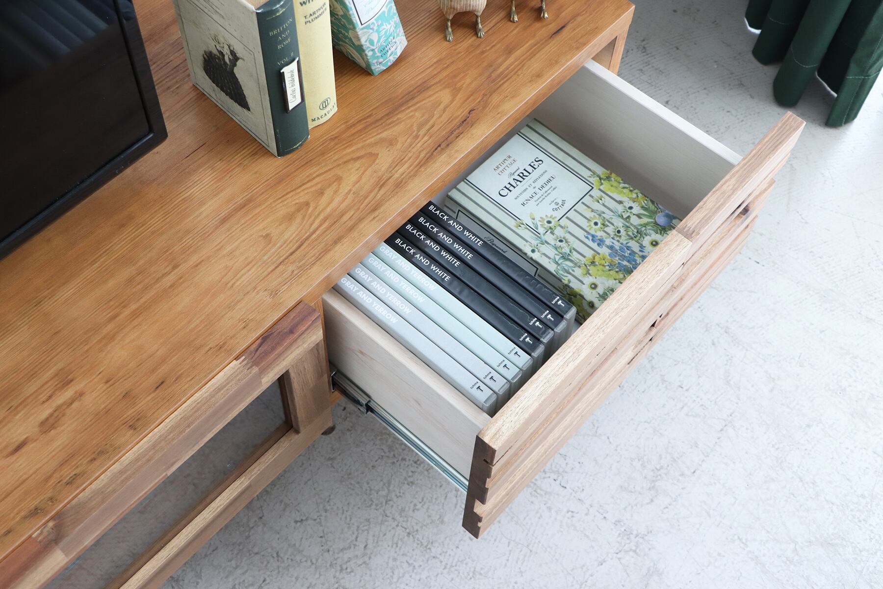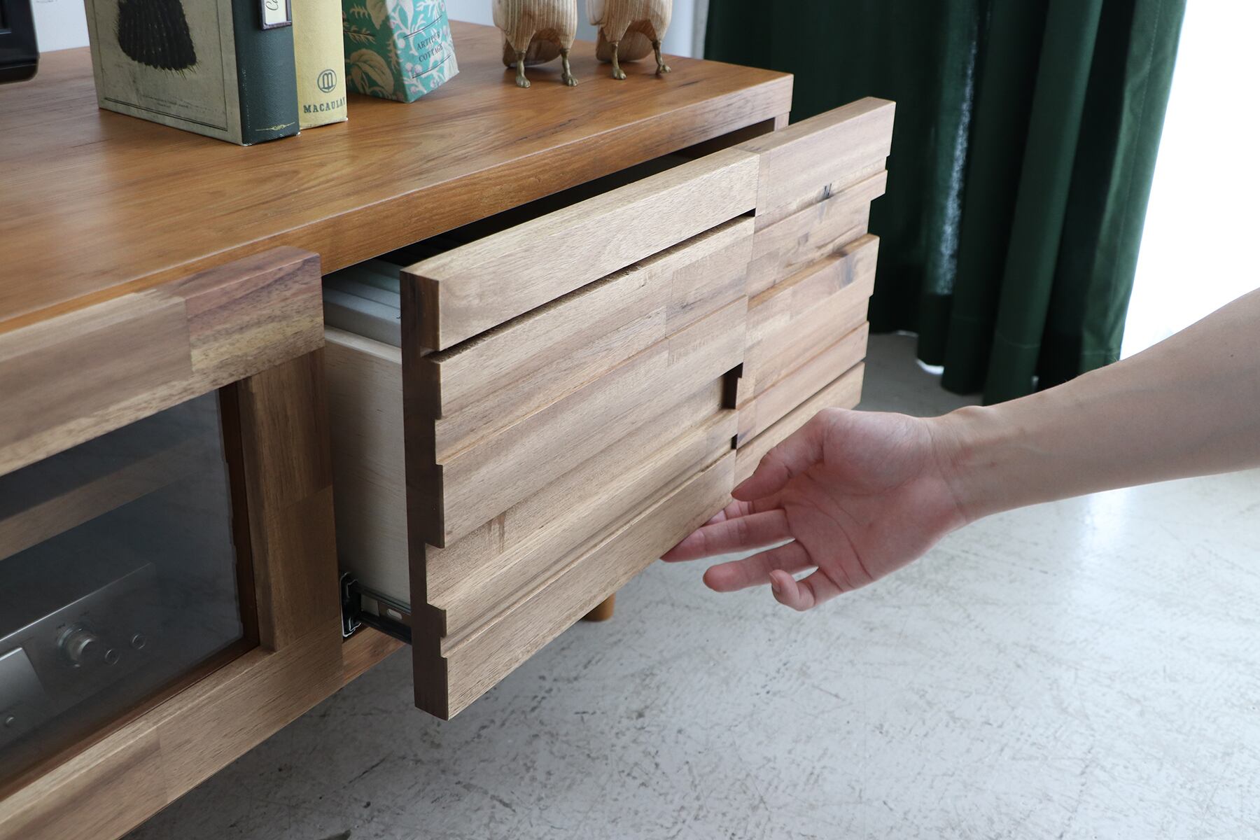 ARG140ローボードは、リビングや寝室のスタイリッシュなアクセントとして機能します。特に、無垢材の自然な凹凸感が魅力で、温かみのある空間を演出します。引き出し付きの設計により、リモコンや雑誌などの小物をすっきり収納できます。